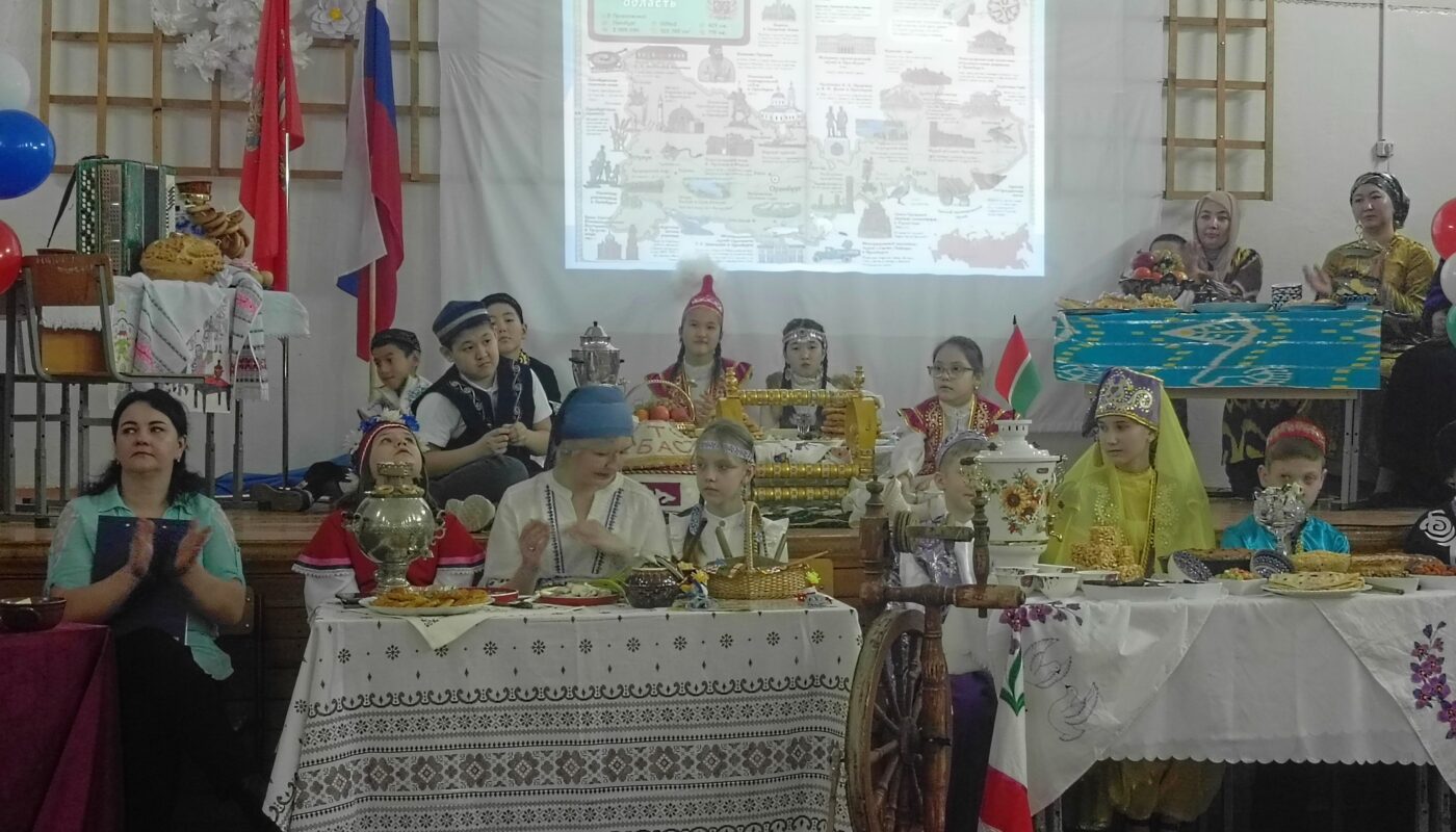 Актовый зал школы превратился в выставку ароматных блюд, ярких костюмов русских, белорусов, татар, казахов, узбеков, азербайджанцев и грузин, населяющих Оренбуржье.