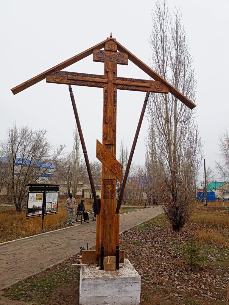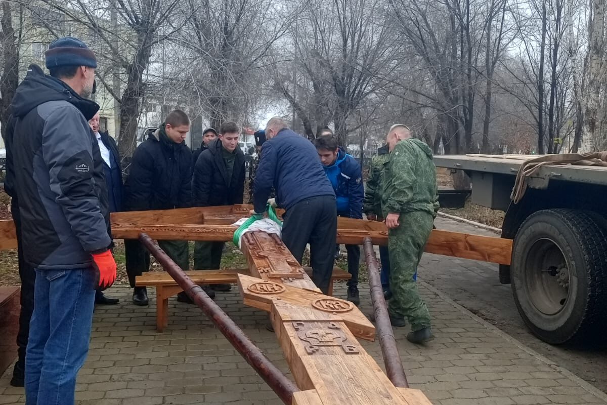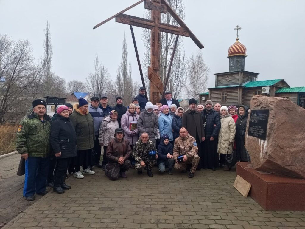 Затем к работе подключились казаки ХКО «Вольное» и «Станица Степная». Техническую помощь в подъёме массивной конструкции на манипуляторе оказал Андрей Сапрыкин. Крест был забетонирован, основание облицовано плиткой. Все работы велись в тесном согласовании с протоиереем Георгием Абашидзе, который сразу же после установки креста освятил его.