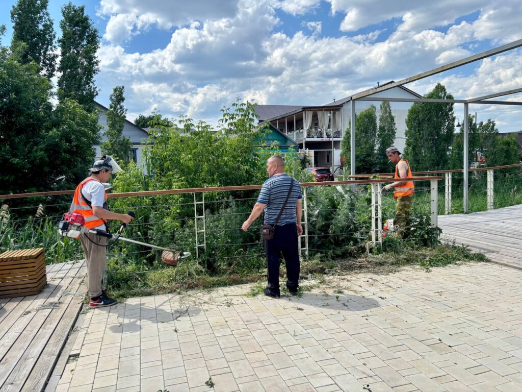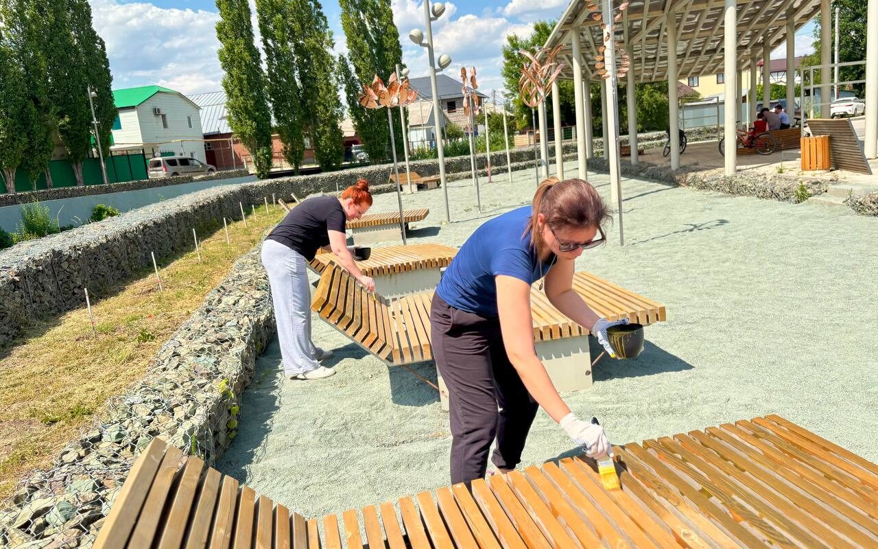Здесь покрасили урны, скамейки и лежаки. Кроме этого, обновили деревянный настил и скосили траву.