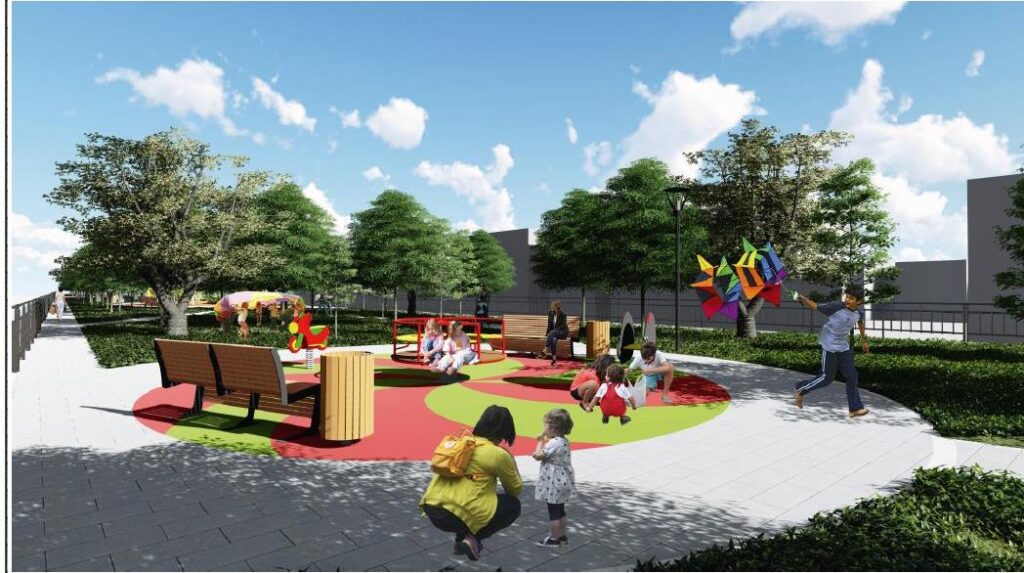 Благоустройство территории предусматривает устройство дорожно-тропиночной сети с плиточным покрытием, устройство зелёных зон с местами для отдыха, устройство уличного освещения. Детское игровое оборудование на благоустраиваемой территории представлено различными качелями, каруселями, балансирами, песочницами, детскими спортивными и игровыми комплексами.