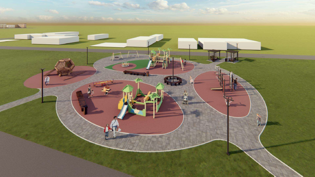 Благоустройство территории предусматривает устройство дорожно-тропиночной сети с плиточным покрытием, устройство зон с местами для отдыха, устройство уличного освещения. Детское игровое оборудование на благоустраиваемой территории представлено различными качелями, каруселями, балансирами, песочницами, детскими спортивными и игровыми комплексами.